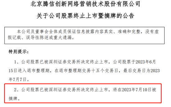 市场对深南退、腾信退的摘牌早有预期。6月7日,两家公司均宣布收到深交所终止上市的决定,并于6月15日进入退市整理期。按照规定,退市整理期交易期限为15个交易日,两家公司最后交易日期均为7月7日,将在次一交易日(即7月10日)摘牌。