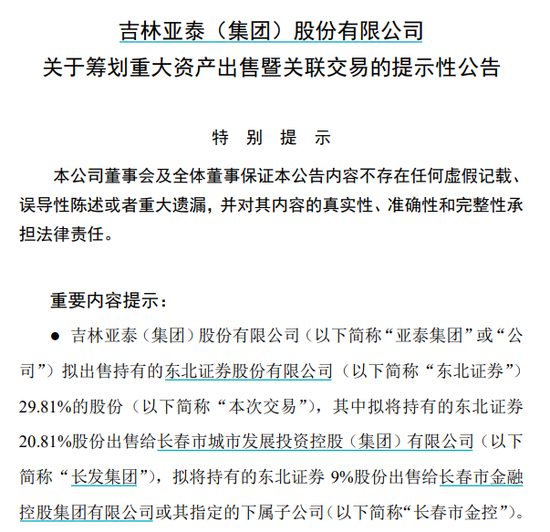 3月27日盘后,亚泰集团公布《关于筹划重大资产出售暨关联交易的提示性公告》。亚泰集团称,公司拟出售持有的东北证券29.81%的股份,其中拟将持有的东北证券20.81%股份出售给长春市城市发展投资控股(集团)有限公司(“长发集团”),拟将持有的东北证券9%股份出售给长春市金融控股集团有限公司或其指定的下属子公司(“长春市金控”)。