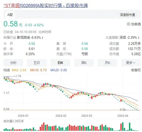 *ST美盛的最新收盘价为0.58元,已连续13个交易日收盘价低于1元,在接下来的7个交易日内,公司股票即使每日涨停也无法在第20个交易日前重返1元,由此提前锁定“1元退市”情形。