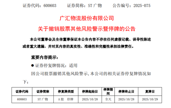 10月27日晚间,ST广物公告称,上海证券交易所已同意撤销公司股票其他风险警示,公司股票将于2025年10月28日停牌一天,自2025年10月29日起复牌交易,并撤销其他风险警示,股票简称由“ST广物”变更为“广汇物流”。