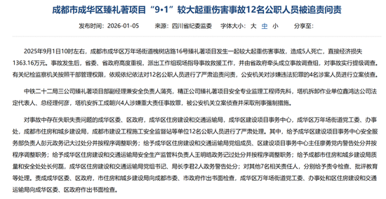 今年1月5日,四川省纪委监委公布对成都市成华区臻礼著项目“9·1”较大起重伤害事故的处理情况: