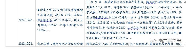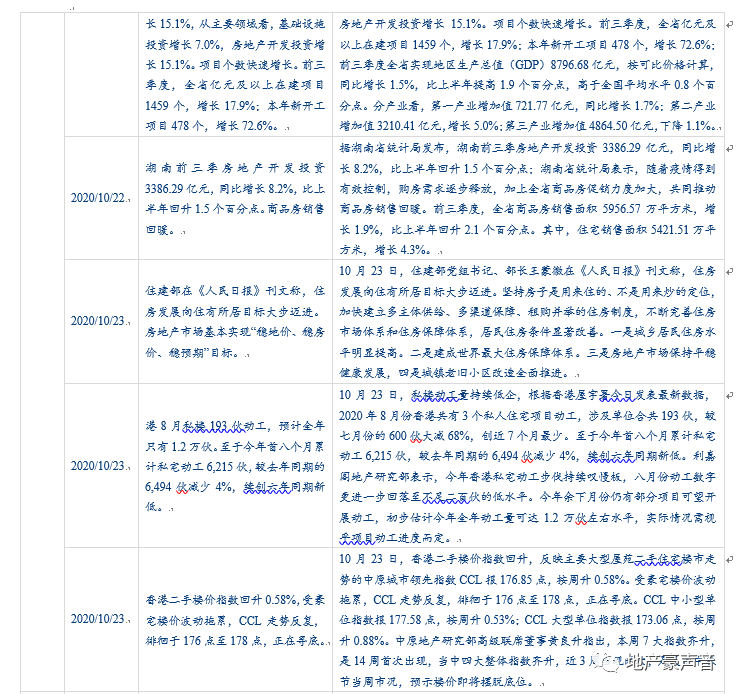 行业:北京住建委:北京将开展为期4个月专项检查,涉严格限购政策执行、房源信息真实等;香港地区政府撤回一手空置税条例草案;深圳市住建局召开会议强调,要以更大力度深化住建领域综合改革,以更大决心为中国特色社会主义住房制度先行示范,要全力推动深圳住房和建设事业不断开拓新局面;南京市住房保障局发布消息称,“商改租”房产税率暂减按4%的税率征收,个人支付房租可抵扣个税;香港9月发出破产令及清盘令创约4年新高;港失业率上升,预计港住宅楼价今年下调约3至5%。本月首20日录3850宗整体物业买卖注册,按月减2.9%;涉及注册金额录约345.26亿港元,较9月同期约305.65亿港元则增加约13.0%;吉林省前三季度房地产开发投资增长15.1%,房地产开发投资增长15.1%。湖南前三季房地产开发投资3386.29亿元,同比增长8.2%,比上半年回升1.5个百分点。商品房销售回暖。住建部刊文称,住房发展向住有所居目标大步迈进;房地产市场基本实现“稳地价、稳房价、稳预期”目标。