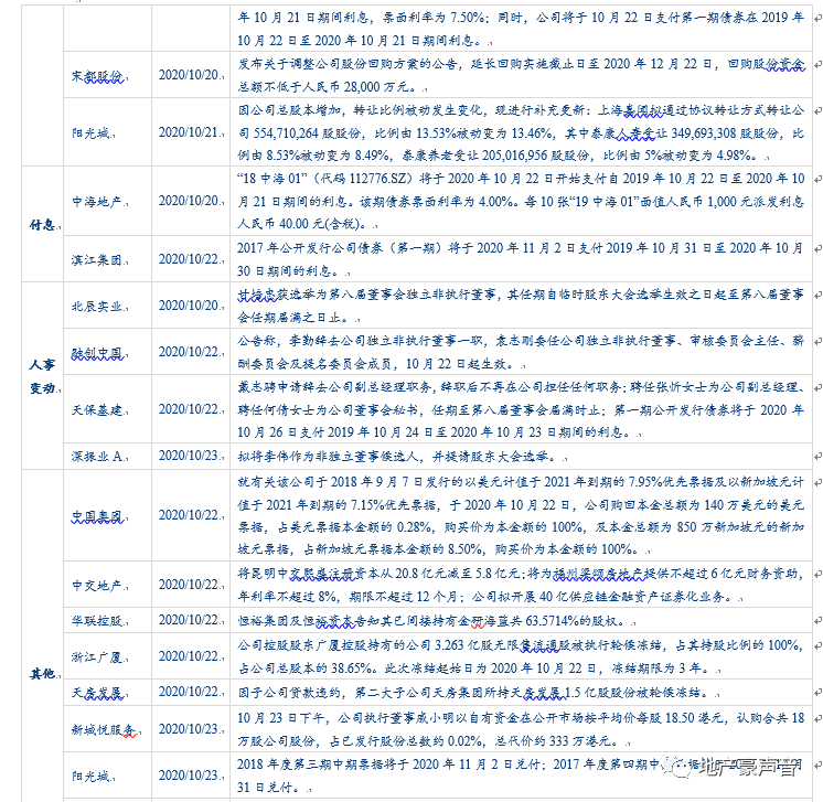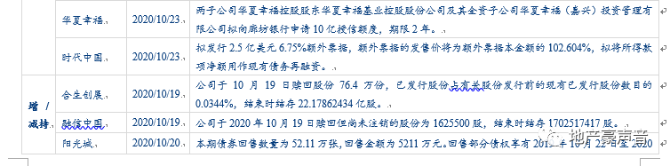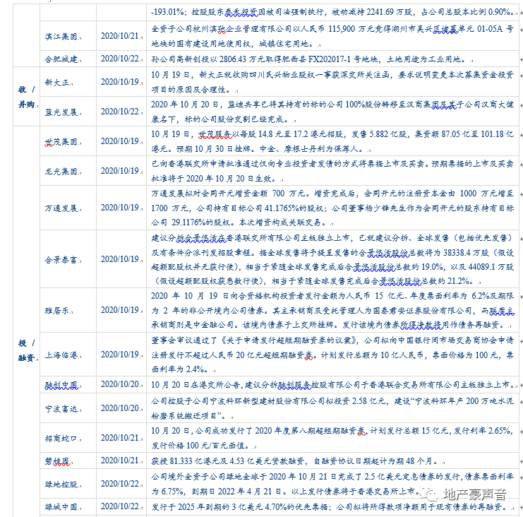 招商蛇口成功发行了2020年度第八期超短期融资券,计划发行总额15亿元,发行利率2.65%,发行价格100元/百元面值;世茂服务以每股14.8元至17.2港元招股,发售5.882亿股,集资额87.05亿至101.18亿港元。预期10月30日挂牌;绿地控股境外全资子公司绿地全球于2020年10月21日完成了2.5亿美元定息债券的发行,债券票面利率为6.75%,到期日2022年4月21日;蓝光发展子公司蓝迪共享已将其持有的标的公司100%股份转移至汉商集团及其子公司汉商大健康名下;新城悦服务执行董事戚小明以自有资金在公开市场按每股18.50港元,认购合共18万股公司股份,占已发行股份总数约0.02%。
