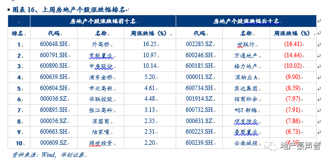 4 一周板块回顾:板块表现方面,SW房地产指数下跌1.12%,沪深300指数下跌1.53%,相对收益为0.41%,板块表现强于大市,在28个板块排名中排第9位。个股表现方面,SW房地产板块涨跌幅排名前5位的房地产个股分别为:外高桥、京能置业、中房股份、浦东金桥、市北高新,上周涨跌幅排名后5位的房地产个股分别为世联行、万通地产、格力地产、深物业A、实达集团。