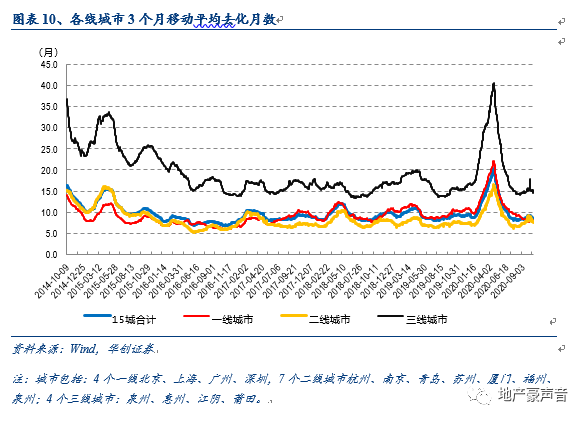 上周末(2020/10/23)15个重点城市住宅3个月移动平均去化月数为8.5个月,环比下降0.3个月。其中,一线城市3个月移动平均去化月数为8.2个月,环比上升0.1个月。北上广深去化月数分别为14.9个月、4.9个月、8.5个月、6.0个月。二线重点城市3个月移动平均去化月数为7.6个月,环比下降0.6个月。三线重点城市3个月移动平均去化月数为14.5个月,环比下降0.5个月。