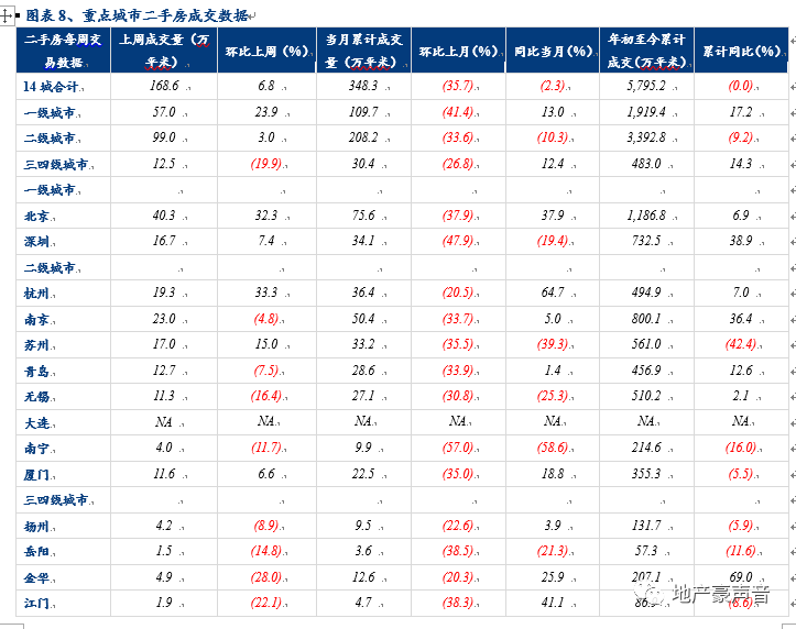 上周(10.17-10.23)8个二线城市二手房房合计成交99.0万平米,环比上升3.0%;10月截至上周累计成交208.2万平米,较9月同期环比下降33.6%,较去年10月同期同比下降10.3%,其中当月成交同比较9月下降22.7pct;年初累计至今成交3,392.8万平米,同比下降9.2%。