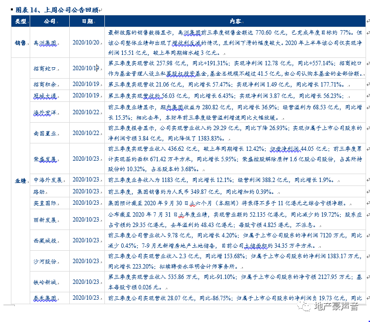 3 公司动态跟踪:招商蛇口前三季度营业收入501亿,同比+96%,归母净利润22亿元,同比-57%;成功发行20年第八期超短融,发行额15亿,利率2.65%;荣盛发展前三季度营业收入437亿,同比+12%;归母净利润44亿,同比-10%;招商积余前三季度营收60亿,同比+52%,归母净利润3亿,同比+137%;泰禾集团前三季度营业收入28亿,同比-87%,归母净利润亏损20亿元,同比-193%;中国海外发展前三季度经营业务收入1,183亿,同比+12%,经营溢利388亿,同比+2%;世茂服务拟以每股14.8-17.2港元招股,发售5.882亿股,集资87-101亿港元,预期10月30日挂牌。