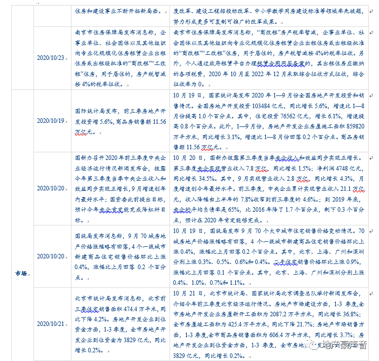 2 主要政策新闻:银保监会副主席周亮:房地产过度金融化势头得到遏制; 央行副行长潘功胜:推动完善房地产金融宏观审慎管理,正在研究进一步完善促进房地产市场健康发展的长效机制;中国前三季度GDP72.3万亿,同比+0.7%,其中Q3单季度同比+4.9%;统计局发布数据,1-9月房地产开发投资同比+5.6%,较前值+1.0pct;新开工面积同比-3.4%,较前值+0.2pct;销售面积同比-1.8%,较前值+1.5pct;9月70城房价涨幅略有回落,4个一线城市新建商品住宅售价环比+0.4%,较8月-0.2pct;北京将开展为期4个月专项检查,涉限购政策执行、房源信息真实等;南京商改租房产税率暂减按4%的税率征收;武汉对住房公积金流动性实施风险管理,若个贷率在85%以下,实施积极宽松的公积金贷款和提取政策,加大对购房缴存职工支持力度。