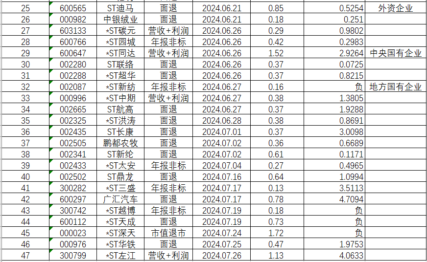 其次是在47只退市股票中,属于中央国有企业的有3家,分别为凯马B、建车B和*ST同达,还有一家地方国有企业为*ST新纺。力场君感到意外的,倒不是退市的绝大多数都是民营企业,而是竟然还真有中央国有企业;特别是仅有的两只退市B股,还都是中央国有企业。
