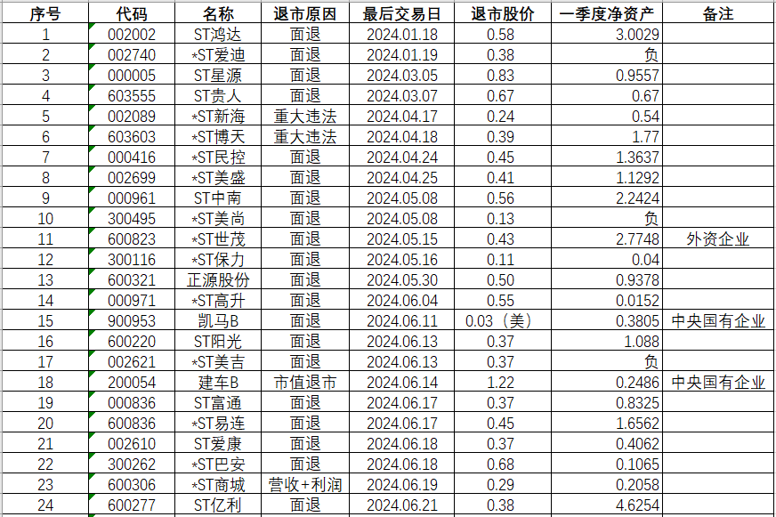 首先是在今年退市的公司中,最近一期每股净资产为正,也即没有出现资不抵债的案例,竟占到了绝大多数;其中最近一期每股净资产高于1元面值的就多达18家,占比约在40%。这是让力场君感到很意外的。