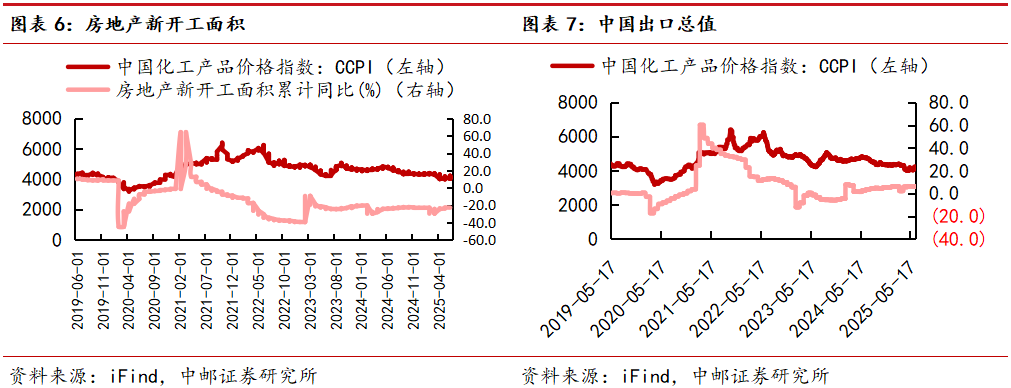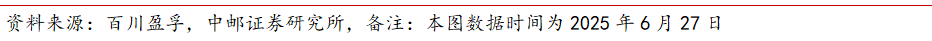 需求端,出口平稳,房产需求待增。中国房地产需求增速处于历史较低水平,2024年1月-12月,中国房地产累计新开工面积增速为-23%,2025年1-6月20日,中国房地产累计新开工面积增速为-22.80%;出口增速比较平稳,2024年1-12月,中国出口总值累计增速为+5.84%。2025年1-6月20日,中国出口总值累计增速为6%。我们预计伴随着国内房地产政策陆续出台、美国制造业PMI回升,中国内外需有望迎来改善。