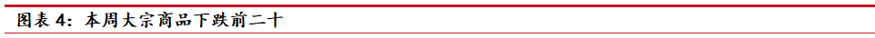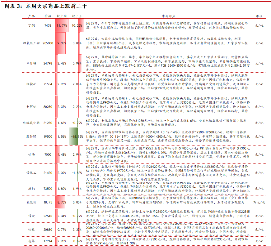 本周大宗商品上涨前二十:丁酮(11.77%)、四氧化三钴(9.33%)、草甘膦(2.48%)、铜精矿(2.26%)、电解铜(2.37%)、电熔氧化锆(1.63%)、脂肪醇(1.56%)、甘油(4.48%)、锌化工(2.39%)、废铜(1.80%)、氧化钴(8.70%)、锌锭(2.34%)、铝锭(0.77%)、废锌(2.28%)、锌合金(2.20%)、废锡(1.89%)、国内锡精矿(2.23%)、锡锭(2.16%)、锡合金(2.01%)、铝板(0.70%)。