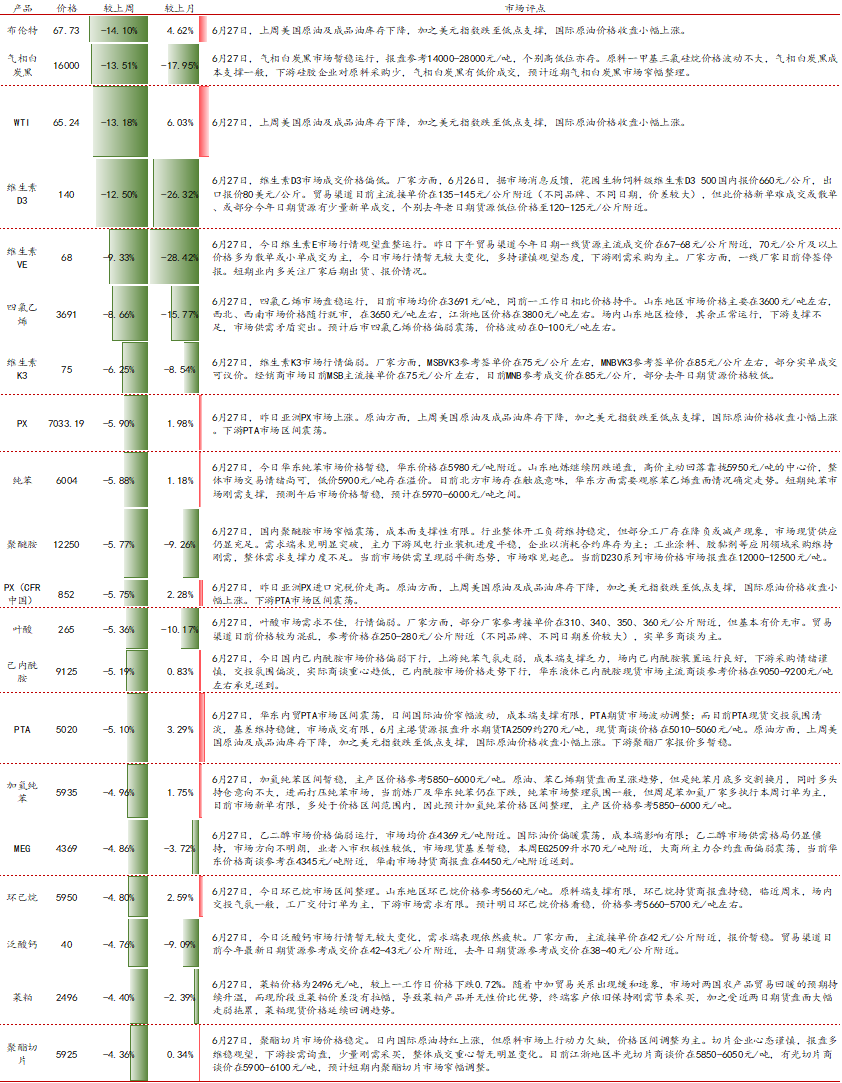油气相关产品价格下跌。布伦特(-14.10%)、气相白炭黑(-13.51%)、WTI(-13.18%)、维生素D3(-12.50%)、维生素VE(-9.33%)、四氯乙烯(-8.66%)、维生素K3(-6.25%)、PX(-5.90%)、纯苯(-5.88%)、聚醚胺(-5.77%)、PX(CFR中国)(-5.75%)、叶酸(-5.36%)、己内酰胺(-5.19%)、PTA(-5.10%)、加氢纯苯(-4.96%)、MEG(-4.86%)、环己烷(-4.80%)、泛酸钙(-4.76%)、菜粕(-4.40%)、聚酯切片(-4.36%)。