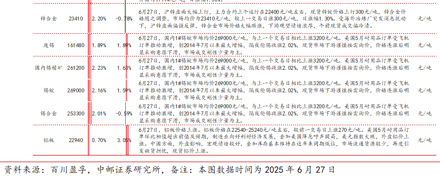 丁酮产品价格上涨。主要上涨产品为丁酮(11.77%)、四氧化三钴(9.33%)、草甘膦(2.48%)、铜精矿(2.26%)、电解铜(2.37%)、电熔氧化锆(1.63%)、脂肪醇(1.56%)、甘油(4.48%)、锌化工(2.39%)、废铜(1.80%)、氧化钴(8.70%)、锌锭(2.34%)、铝锭(0.77%)、废锌(2.28%)、锌合金(2.20%)、废锡(1.89%)、国内锡精矿(2.23%)、锡锭(2.16%)、锡合金(2.01%)、铝板(0.70%)。