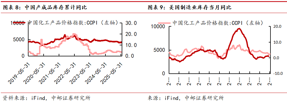 库存端,中美均处于累库阶段。2023年3月中国化工品库存增速达到近年高点,为10.7%。此后,行业主动去库存,累库速度放缓,2024年1-12月,中国产成品累计同比增速为3.3%。2025年1-6月,中国产成品累计同比增速为3.9%。2022年5月美国制造业库存增速达到近年高点,为11.30%。此后,美国进入主动去库存阶段,2023年10月-2024年2月美国制造业库存连续五个月出现负增长,2024年11月至2025年4月,美国制造业库存持续转正。