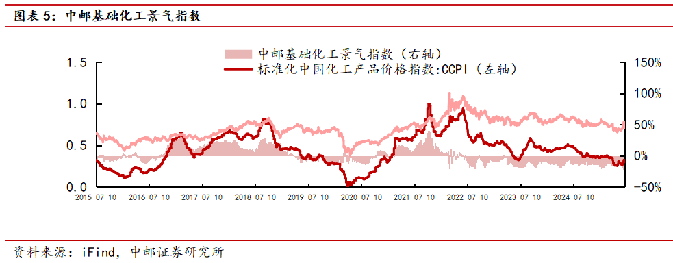 中邮证券基础化工景气指数持续底部运行。我们以Brent原油现货价格作为化工企业表示成本项,以中国化工品价格指数表示收入项,并将两种标准化处理,以两者差值表示化工企业盈利状况,命名为中邮证券基础化工指数。2020年3月—2021年10月基础化工盈利能力处于景气周期,持续时间约19个月,主因是内外需持续向好,叠加行业新增产能有限,行业进入主动补库存周期。2021年10月基础化工盈利出现向下拐点。2022年2月,受俄乌冲突等地缘政治因素影响,作为基础化工行业成本端的原油、煤炭等能源品供需偏紧。与此同时,基础化工行业受出口与内需增速放缓,行业开工率提升、资本开支转固等因素影响,供需偏于宽松,利润向产业链上游集中。此后,成本端供需偏紧,商品端供需宽松局面并未出现较大转变,基础化工行业盈利持续运行底部区间。