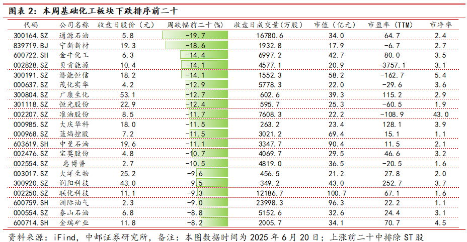 本周基础化工板块下跌排序前二十:通源石油(-19.75%)、宁新新材(-18.65%)、金牛化工(-14.44%)、贝肯能源(-14.10%)、潜能恒信(-14.08%)、茂化实华(-12.94%)、广康生化(-12.75%)、恒光股份(-12.41%)、准油股份(-11.75%)、大庆华科(-11.49%)、蓝焰控股(-11.48%)、中曼石油(-11.10%)、宝莫股份(-10.74%)、惠博普(-10.46%)、大洋生物(-9.57%)、润阳科技(-9.52%)、联化科技(-9.28%)、洲际油气(-9.02%)、泰山石油(-8.82%)、金瑞矿业(-8.16%)。