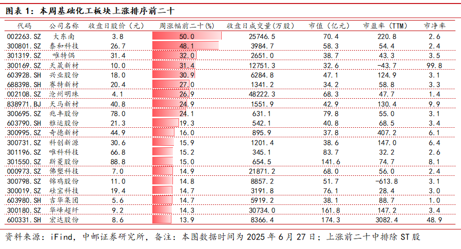 本周基础化工板块上涨排序前二十:大东南(50.00%)、泰和科技(48.09%)、唯特偶(32.04%)、天晟新材(31.41%)、兴业股份(30.93%)、赛特新材(27.02%)、沧州明珠(26.93%)、天马新材(24.91%)、兆丰股份(24.15%)、雅运股份(19.25%)、奇德新材(16.05%)、科创新源(15.94%)、唯科科技(15.18%)、斯菱股份(15.04%)、佛塑科技(14.87%)、锦鸡股份(14.79%)、硅宝科技(14.70%)、吉华集团(14.66%)、华峰超纤(14.30%)、宏达股份(13.94%)。