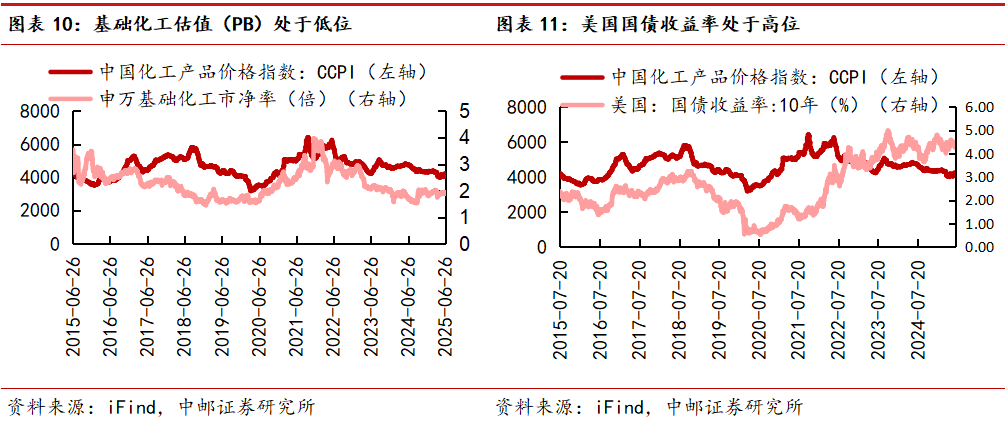 估值端,估值有望迎来提升。截止2025年6月27日,基础化工估值(PB)为1.94倍,处于2014年以来17.22%低分位,十年期美国国债收益率4.29%,处于2014年以来84.53%高分位,估值有望迎来提升。