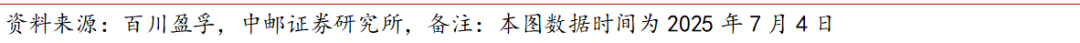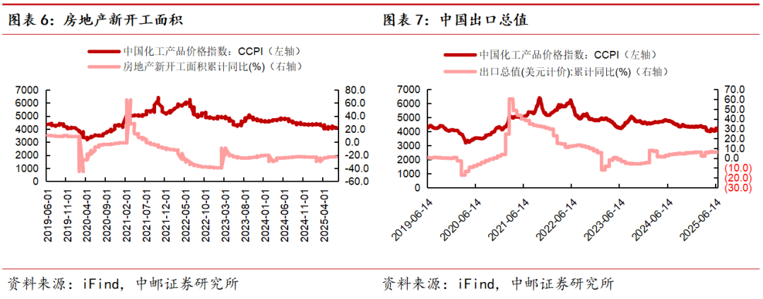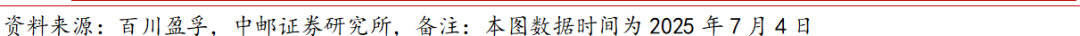 需求端,出口平稳,房产需求待增。中国房地产需求增速处于历史较低水平,2024年1月-12月,中国房地产累计新开工面积增速为-23%,2025年1-6月20日,中国房地产累计新开工面积增速为-22.80%;出口增速比较平稳,2024年1-12月,中国出口总值累计增速为+5.84%。2025年1-6月20日,中国出口总值累计增速为6%。我们预计伴随着国内房地产政策陆续出台、美国制造业PMI回升,中国内外需有望迎来改善。
