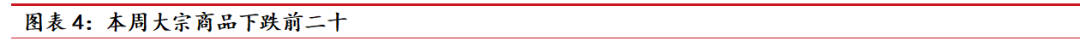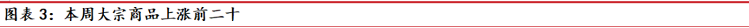 本周大宗商品上涨前二十:二氯丙烷-白料(8.82%)、异丁醛(7.20%)、TDI(7.02%)、丁酮(6.39%)、生猪(5.35%)、硫铁矿(3.82%)、DMF(3.77%)、丙烯酸(3.65%)、醋酸乙烯(3.21%)、甘油(2.86%)、二氯甲烷(2.81%)、WTI(2.70%)、醚后碳四(2.58%)、乙烯(2.57%)、铁矿石(2.56%)、氧化镝(2.17%)、工业级碳酸锂(2.08%)、电池级碳酸锂(2.05%)、碳酸钴(2.04%)、草甘膦(2.03%)。