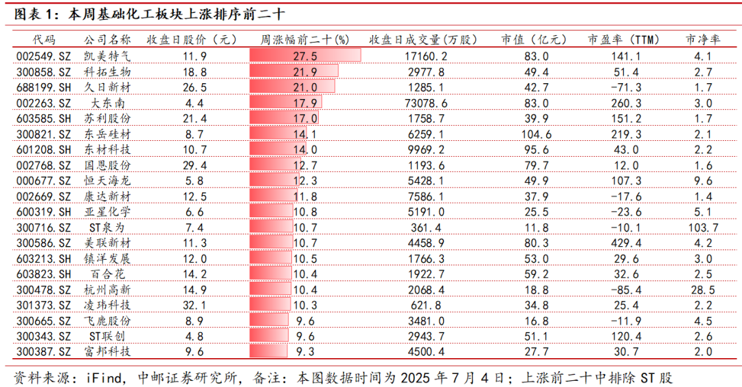 本周基础化工板块上涨排序前二十:凯美特气(27.46%)、科拓生物(21.90%)、久日新材(21.01%)、大东南(17.87%)、苏利股份(17.00%)、东岳硅材(14.14%)、东材科技(14.01%)、国恩股份(12.65%)、恒天海龙(12.26%)、康达新材(11.82%)、亚星化学(10.77%)、ST泉为(10.69%)、美联新材(10.69%)、镇洋发展(10.50%)、百合花(10.41%)、杭州高新(10.39%)、凌玮科技(10.25%)、飞鹿股份(9.64%)、ST联创(9.63%)、富邦科技(9.34%)。