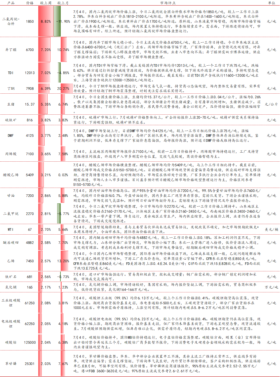 二氯丙烷产品价格上涨。主要上涨产品为二氯丙烷-白料(8.82%)、异丁醛(7.20%)、TDI(7.02%)、丁酮(6.39%)、生猪(5.35%)、硫铁矿(3.82%)、DMF(3.77%)、丙烯酸(3.65%)、醋酸乙烯(3.21%)、甘油(2.86%)、二氯甲烷(2.81%)、WTI(2.70%)、醚后碳四(2.58%)、乙烯(2.57%)、铁矿石(2.56%)、氧化镝(2.17%)、工业级碳酸锂(2.08%)、电池级碳酸锂(2.05%)、碳酸钴(2.04%)、草甘膦(2.03%)。
