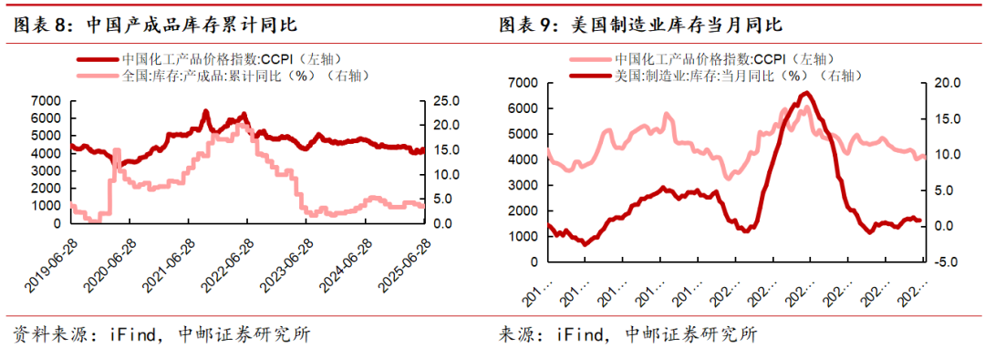 库存端,中美均处于累库阶段。2023年3月中国化工品库存增速达到近年高点,为10.7%。此后,行业主动去库存,累库速度放缓,2024年1-12月,中国产成品累计同比增速为3.3%。2025年1-6月,中国产成品累计同比增速为3.9%。2022年5月美国制造业库存增速达到近年高点,为11.30%。此后,美国进入主动去库存阶段,2023年10月-2024年2月美国制造业库存连续五个月出现负增长,2024年11月至2025年4月,美国制造业库存持续转正。