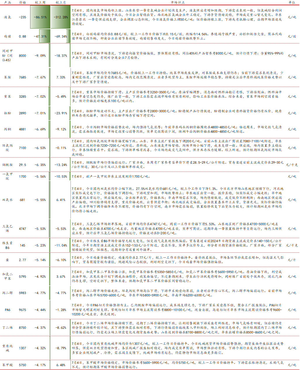 本周大宗商品下跌前二十:液氯(-86.51%)、鸡苗(-47.31%)、间对甲酚(间位45)(-9.09%)、苯胺(-7.67%)、重苯(-7.02%)、粗酚(-7.01%)、丙酮(-6.69%)、环氧丙烷(-6.53%)、烟酰胺(-6.35%)、一氯甲烷(-5.56%)、双氧水(-5.55%)、三氯乙烯(-5.53%)、维生素B6(-5.23%)、蛋(-5.14%)、加氢二甲苯(-4.92%)、丙二醇(-4.77%)、PA6(-4.44%)、丁二烯(-4.37%)、重质纯碱(-4.32%)、苯甲酸(-4.17%)。