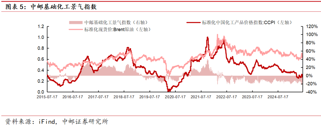 中邮证券基础化工景气指数持续底部运行。我们以Brent原油现货价格作为化工企业表示成本项,以中国化工品价格指数表示收入项,并将两种标准化处理,以两者差值表示化工企业盈利状况,命名为中邮证券基础化工指数。2020年3月—2021年10月基础化工盈利能力处于景气周期,持续时间约19个月,主因是内外需持续向好,叠加行业新增产能有限,行业进入主动补库存周期。2021年10月基础化工盈利出现向下拐点。2022年2月,受俄乌冲突等地缘政治因素影响,作为基础化工行业成本端的原油、煤炭等能源品供需偏紧。与此同时,基础化工行业受出口与内需增速放缓,行业开工率提升、资本开支转固等因素影响,供需偏于宽松,利润向产业链上游集中。此后,成本端供需偏紧,商品端供需宽松局面并未出现较大转变,基础化工行业盈利持续运行底部区间。