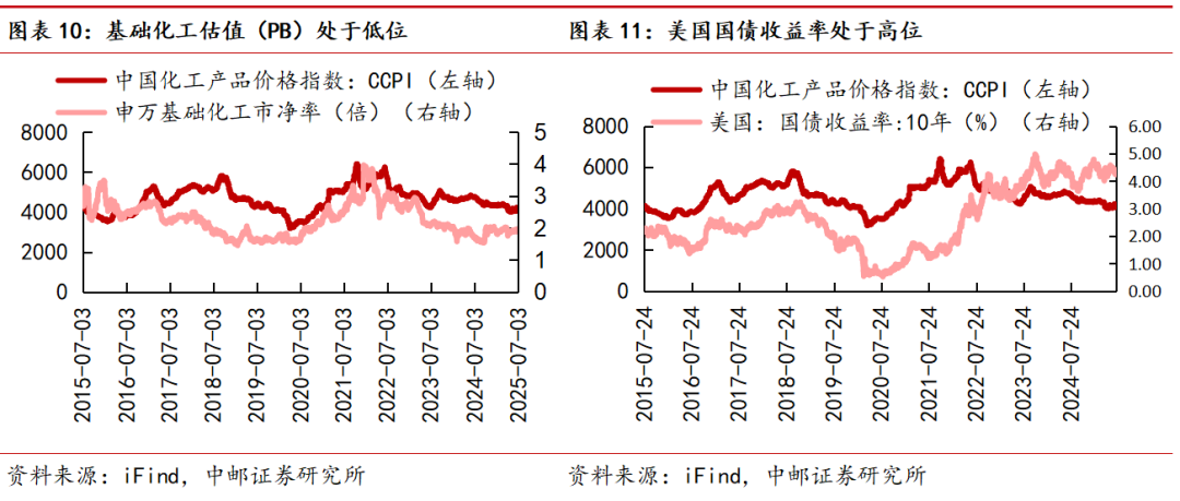 估值端,估值有望迎来提升。截止2025年7月4日,基础化工估值(PB)为1.94倍,处于2014年以来17.17%低分位,十年期美国国债收益率4.35%,处于2014年以来85.87%高分位,估值有望迎来提升。