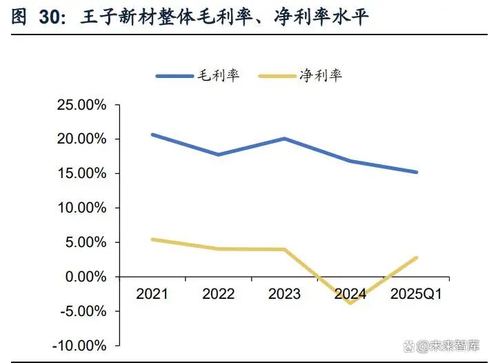 公司主要业务涵盖包装材料领域。深圳王子新材料股份有限公司成立于1997年, 国内中小板上市公司。公司坚持以“可降解、可视化、轻量化、功能化”的产品战 略推动产品的持续发展。产品广泛涉足新型环保包装材料、新能源产品、可视化包 装材料、电子&网络产品包装材料、半导体包装周边材料、食品&药品印刷类包装材 料、薄蜂窝纸包装材料、EPS包装材料、塑料托盘&胶袋包装材料等。在做大做强上 述主业的同时,王子新材重点推出半导体高端包装材料(包括IC TRAY、载带等)、 生物降解材料及其制品、消费电子产品(包括移动电源、无线充等)、电子烟、新 能源(包括储能电池、动力电池)。 收入水平保持增长,盈利能力有所波动。2024年公司分别实现营收和归母净利 润19.89亿元和-0.69亿元,同比+12.15%和-213.51%。25年第一季度公司实现营收 和归母净利润5.17亿元和0.084亿元,同比+36.21%和+66.29%,整体营收规模保持 增长。根据公司《002735王子新材投资者关系管理信息20250514》公告,2024年 度为公司上市以来首次出现亏损,主要原因系计提相关资产减值损失10,725.36万元 所致,其中包含2024年度针对重庆富易达资产组计提的商誉减值6,890.24万元。公 司军工电子业务盈利不及预期,主要系受行业内多种因素影响所致;薄膜电容2024 年度出现亏损,主要系募投项目实施初期,新的产能尚在建设之中,因前期投入较 大所致。利润率方面,公司整体毛利率基本稳定,2025年第一季度整体毛利率 +15.19%,相较23/24年小幅下滑。