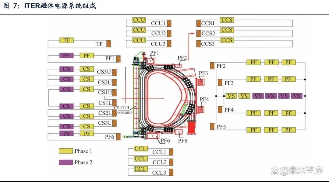 根据《ITER聚变装置及其电源系统》,ITER托卡马克聚变装置主要由18个环向 场线圈(TF)、6个极向场线圈(PF)以及包含6个独立绕包模块的中心螺管线圈(CS) 组成,此外还包括部分校正线圈CCS等。根据《国际聚变堆装置电源系统综述》, 在ITER装置实际运行时,由于等离子体运行的不稳定性和变化,其要求的电流波形 是实时变化和振荡的。作为ITER装置的超导磁体电源,其要求的特点是:①能实时 输出任意的电流波形,实施对等离子体位置和形状等的反馈控制,电压响应时间小 于2ms;②负载各超导线圈之间存在强烈的耦合,电源运行中要考虑相互耦合效应。