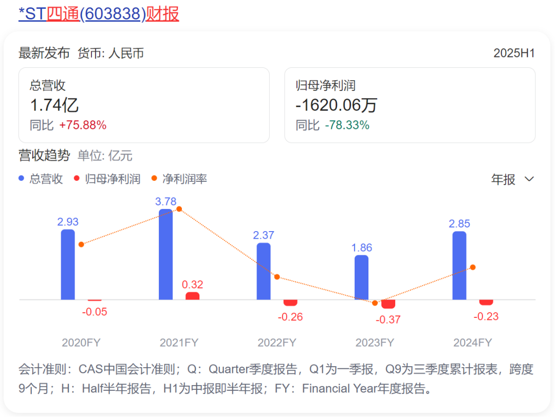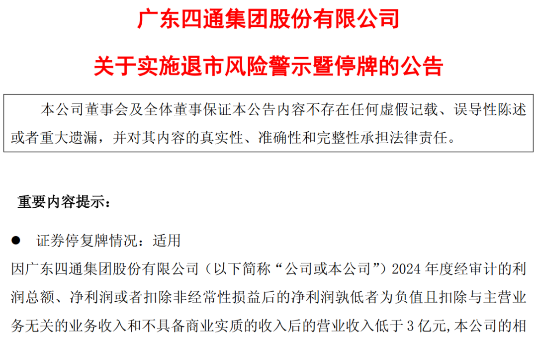 4月29日,由黄建平实际控制的*ST四通(四通股份603838.SH)发布关于实施退市风险警示暨停牌的公告显示,因该公司2024年度经审计的扣非净利润为负,且扣非营业收入低于3亿元。根据《上海证券交易所股票上市规则》的相关规定,四通股份股票于2025年4月29日停牌1天,于2025年4月30日起实施退市风险警示,股票简称由“四通股份”变更为“*ST四通”。