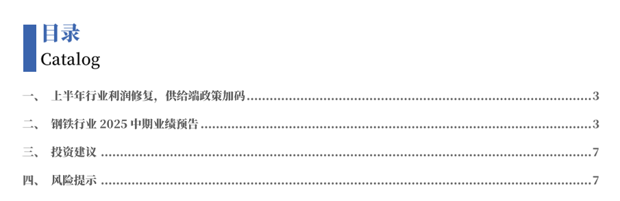 近日钢企陆续分布2025上半年业绩预告,龙头钢企归母净利润高增,部分钢企利润同比减亏,钢铁行业整体盈利能力修复。在供给侧反内卷持续推进的背景下,钢铁行业产能持续向优质龙头集中,我们认为行业有望持续受益于基建项目需求释放和反内卷产能调控加速,细分龙头及业绩改善是重点关注方向。