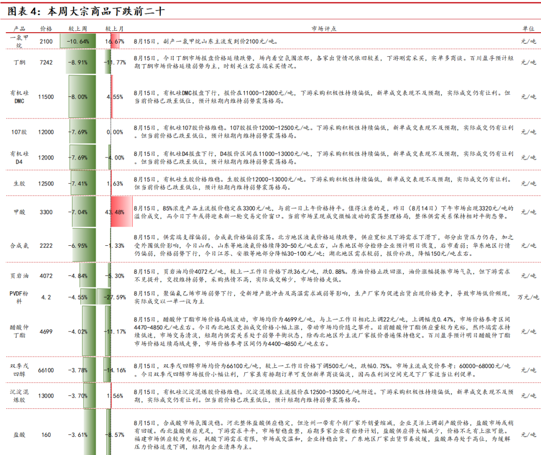 本周大宗商品下跌前二十:一氯甲烷(-10.64%)、丁酮(-8.91%)、有机硅DMC(-8.00%)、107胶(-7.69%)、有机硅D4(-7.69%)、生胶(-7.41%)、甲酸(-7.04%)、合成氨(-6.95%)、页岩油(-4.84%)、PVDF粉料(-4.55%)、醋酸仲丁酯(-4.02%)、双季戊四醇(-3.78%)、沉淀混炼胶(-3.70%)、盐酸(-3.61%)、碳酸锆(-3.57%)、菜粕(-3.47%)、氧氯化锆(-3.39%)、TMA(-3.33%)、氧化铬绿(-3.17%)、BDO(-3.14%)。