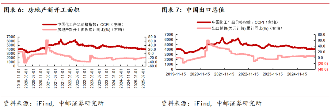 需求端,出口平稳,房产需求待增。中国房地产需求增速处于历史较低水平,2024年1月-12月,中国房地产累计新开工面积增速为-23%,2025年1-6月20日,中国房地产累计新开工面积增速为-22.80%;出口增速比较平稳,2024年1-12月,中国出口总值累计增速为+5.84%。2025年1-6月20日,中国出口总值累计增速为6%。我们预计伴随着国内房地产政策陆续出台、美国制造业PMI回升,中国内外需有望迎来改善。