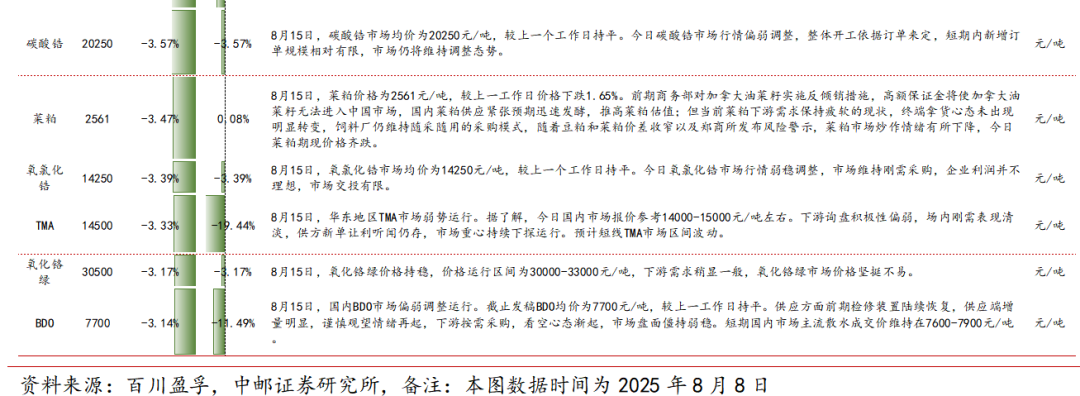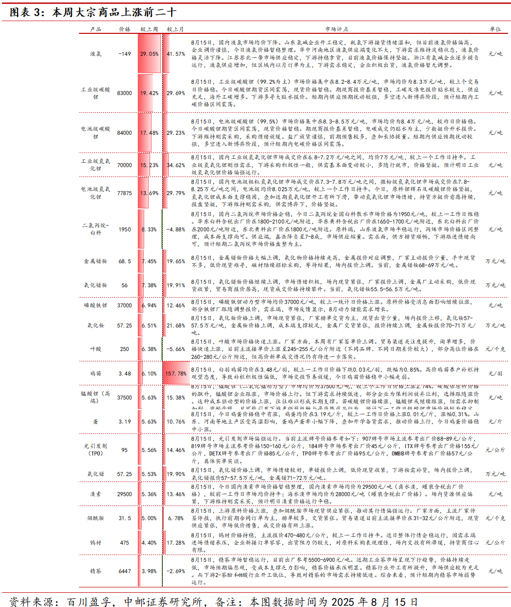 碳酸锂相关价格上涨。主要上涨产品为液氯(29.05%)、工业级碳酸锂(19.42%)、电池级碳酸锂(17.48%)、工业级氢氧化锂(15.23%)、电池级氢氧化锂(13.69%)、二氯丙烷-白料(8.33%)、金属镨钕(7.45%)、氧化镨钕(7.38%)、磷酸铁锂(6.94%)、氧化钕(6.51%)、叶酸(6.38%)、鸡苗(6.10%)、锰酸锂(高端)(5.63%)、蛋(5.63%)、光引发剂(TPO)(5.56%)、氧化镨(5.53%)、溴素(5.36%)、烟酰胺(5.00%)、钨材(4.40%)、精萘(3.98%)。