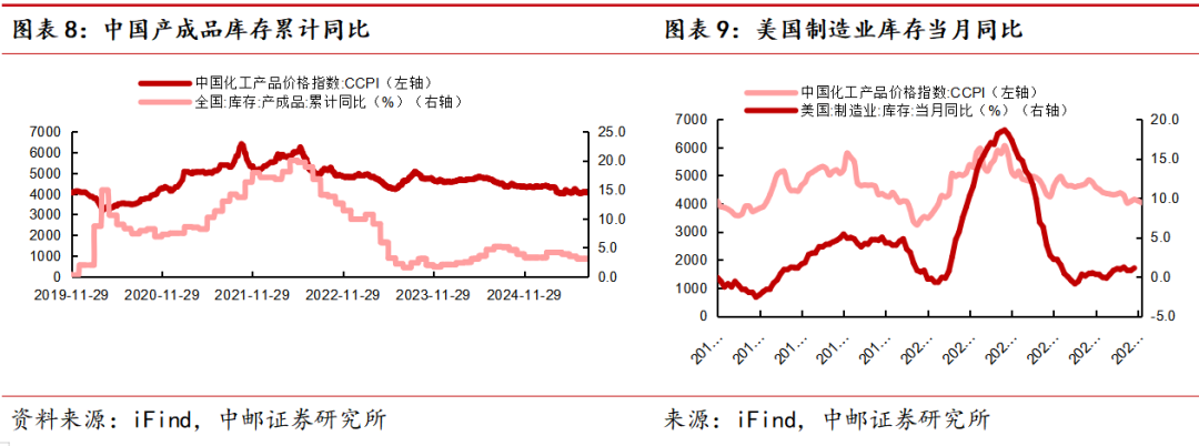 库存端,中美均处于累库阶段。2023年3月中国化工品库存增速达到近年高点,为10.7%。此后,行业主动去库存,累库速度放缓,2024年1-12月,中国产成品累计同比增速为3.3%。2025年1-6月,中国产成品累计同比增速为3.9%。2022年5月美国制造业库存增速达到近年高点,为11.30%。此后,美国进入主动去库存阶段,2023年10月-2024年2月美国制造业库存连续五个月出现负增长,2024年11月至2025年4月,美国制造业库存持续转正。