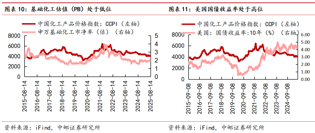 估值端,估值有望迎来提升。截止2025年8月15日,基础化工估值(PB)为1.98倍,处于2014年以来21.04%低分位,十年期美国国债收益率4.33%,处于2014年以来85.43%高分位,估值有望迎来提升。