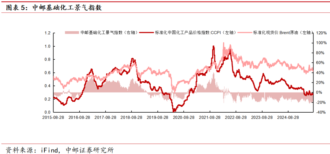 中邮证券基础化工景气指数持续底部运行。我们以Brent原油现货价格作为化工企业表示成本项,以中国化工品价格指数表示收入项,并将两种标准化处理,以两者差值表示化工企业盈利状况,命名为中邮证券基础化工指数。2020年3月—2021年10月基础化工盈利能力处于景气周期,持续时间约19个月,主因是内外需持续向好,叠加行业新增产能有限,行业进入主动补库存周期。2021年10月基础化工盈利出现向下拐点。2022年2月,受俄乌冲突等地缘政治因素影响,作为基础化工行业成本端的原油、煤炭等能源品供需偏紧。与此同时,基础化工行业受出口与内需增速放缓,行业开工率提升、资本开支转固等因素影响,供需偏于宽松,利润向产业链上游集中。此后,成本端供需偏紧,商品端供需宽松局面并未出现较大转变,基础化工行业盈利持续运行底部区间。