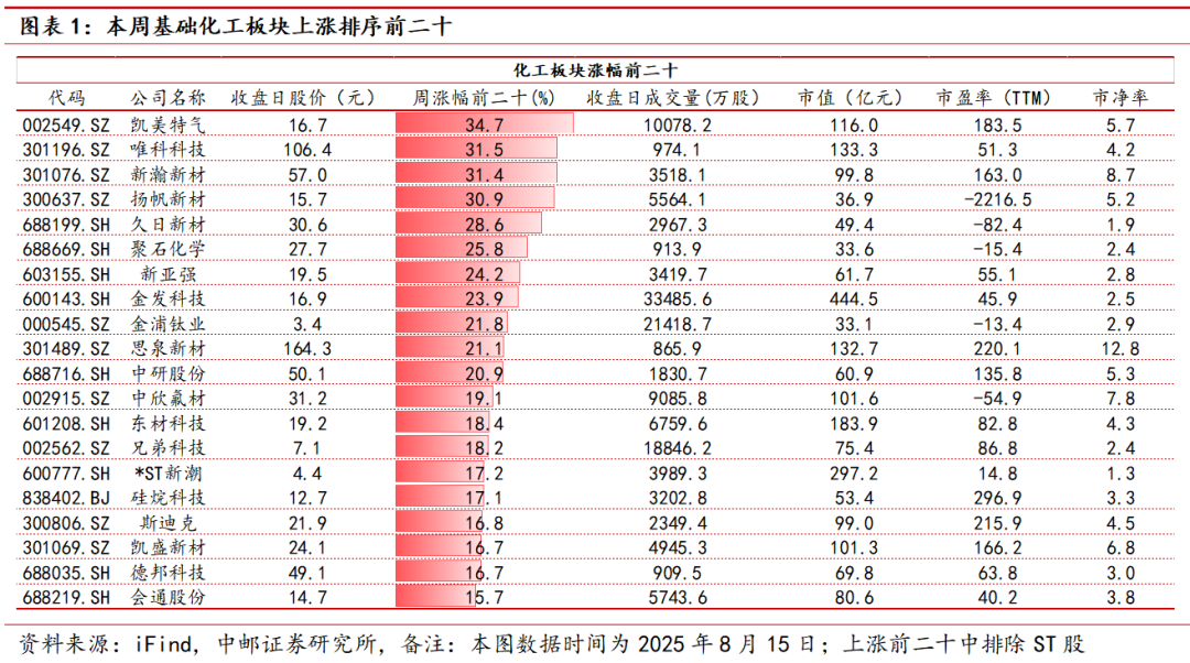 本周基础化工板块上涨排序前二十:凯美特气(34.73%)、唯科科技(31.54%)、新瀚新材(31.43%)、扬帆新材(30.95%)、久日新材(28.60%)、聚石化学(25.82%)、新亚强(24.22%)、金发科技(23.88%)、金浦钛业(21.82%)、思泉新材(21.11%)、中研股份(20.92%)、中欣氟材(19.11%)、东材科技(18.42%)、兄弟科技(18.17%)、*ST新潮(17.16%)、硅烷科技(17.11%)、斯迪克(16.78%)、凯盛新材(16.72%)、德邦科技(16.67%)、会通股份(15.72%)。