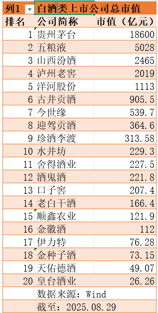 截至8月29日,上述20家白酒上市公司的总市值,同样呈现出明显的5大阵营。