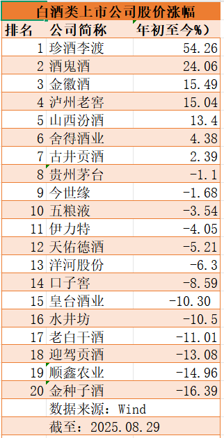 从股价涨跌幅角度看,截至8月29日,上述20家白酒上市公司中,今年以来上涨的仅7家,下跌的公司高达13家。