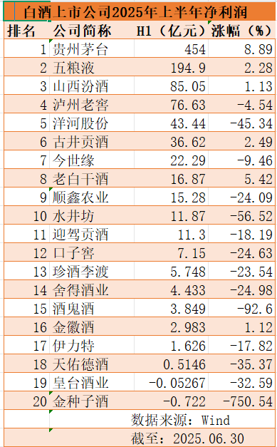 贵州茅台、五粮液排在第一阵营,上半年净利润都在100亿以上;