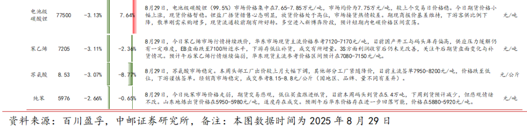 正丙醇价格下跌。液氯(-37.78%)、正丙醇(-9.40%)、一氯甲烷(-7.50%)、甲酸(-5.65%)、碳酸二甲酯(-5.56%)、PVDF粉料(-4.88%)、乙腈(-4.11%)、工业级碳酸锂(-3.80%)、复印纸(-3.65%)、氧化镨钕(-3.63%)、TDI(-3.60%)、双季戊四醇(-3.44%)、铋锭(-3.42%)、氧化铋(-3.39%)、煤焦油(-3.31%)、丙烯酸(-3.31%)、电池级碳酸锂(-3.13%)、苯乙烯(-3.11%)、苏氨酸(-3.07%)、纯苯(-2.66%)。