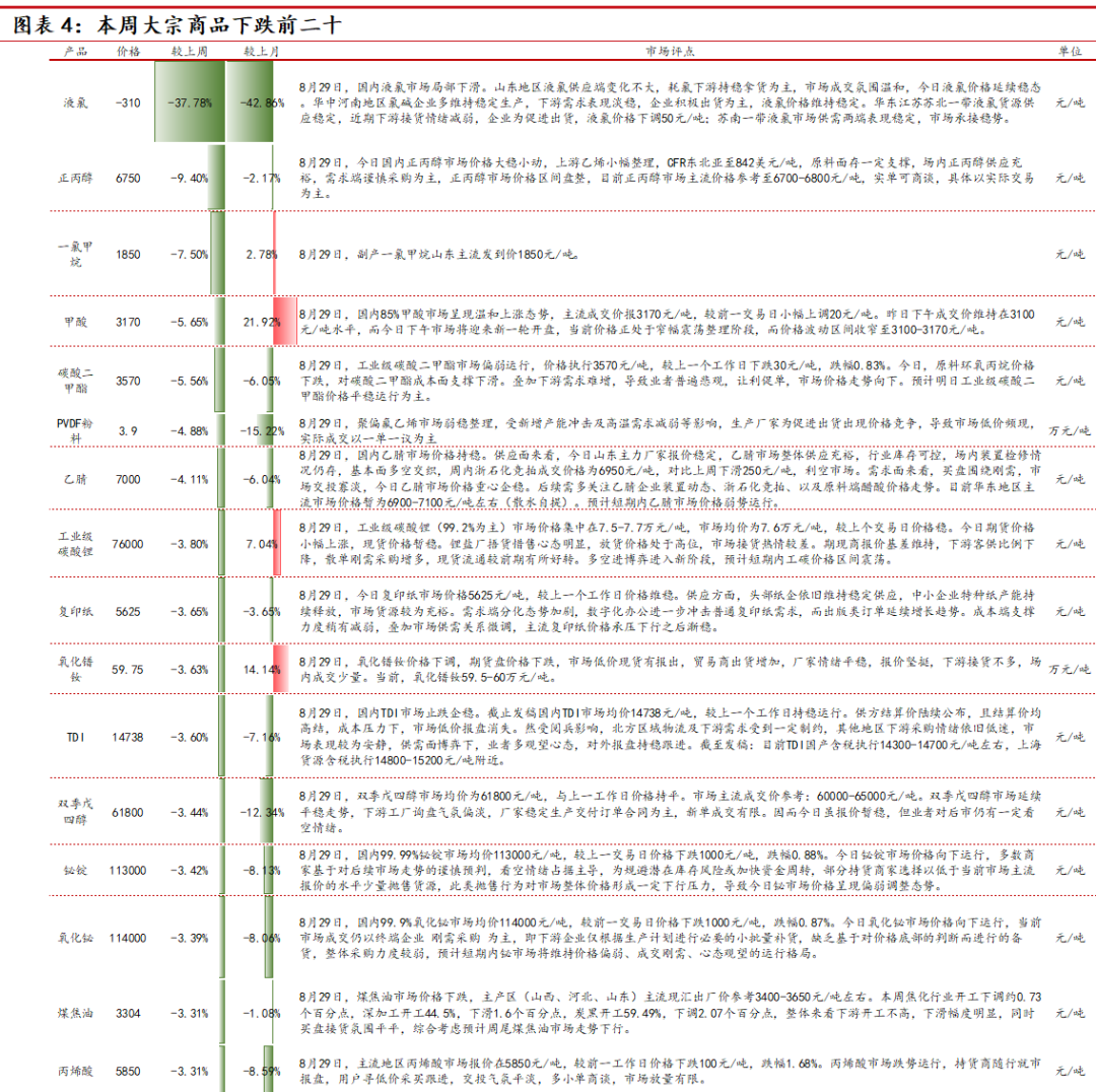 本周大宗商品下跌前二十:液氯(-37.78%)、正丙醇(-9.40%)、一氯甲烷(-7.50%)、甲酸(-5.65%)、碳酸二甲酯(-5.56%)、PVDF粉料(-4.88%)、乙腈(-4.11%)、工业级碳酸锂(-3.80%)、复印纸(-3.65%)、氧化镨钕(-3.63%)、TDI(-3.60%)、双季戊四醇(-3.44%)、铋锭(-3.42%)、氧化铋(-3.39%)、煤焦油(-3.31%)、丙烯酸(-3.31%)、电池级碳酸锂(-3.13%)、苯乙烯(-3.11%)、苏氨酸(-3.07%)、纯苯(-2.66%)。