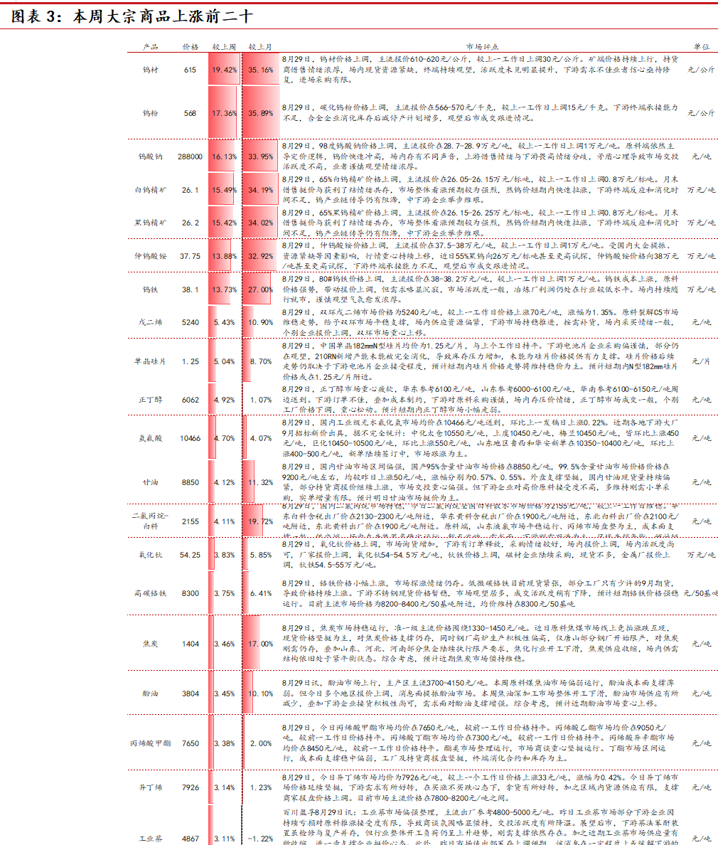 本周大宗商品上涨前二十:钨材(19.42%)、钨粉(17.36%)、钨酸钠(16.13%)、白钨精矿(15.49%)、黑钨精矿(15.42%)、仲钨酸铵(13.88%)、钨铁(13.73%)、戊二烯(5.43%)、单晶硅片(5.04%)、正丁醇(4.92%)、氢氟酸(4.70%)、甘油(4.12%)、二氯丙烷-白料(4.11%)、氧化钬(3.83%)、高碳铬铁(3.75%)、焦炭(3.46%)、酚油(3.45%)、丙烯酸甲酯(3.38%)、异丁烯(3.14%)、工业萘(3.11%)。
