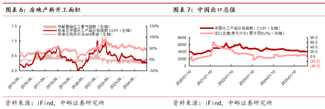 需求端,出口平稳,房产需求待增。中国房地产需求增速处于历史较低水平,2024年1月-12月,中国房地产累计新开工面积增速为-23%,2025年1-6月20日,中国房地产累计新开工面积增速为-22.80%;出口增速比较平稳,2024年1-12月,中国出口总值累计增速为+5.84%。2025年1-6月20日,中国出口总值累计增速为6%。我们预计伴随着国内房地产政策陆续出台、美国制造业PMI回升,中国内外需有望迎来改善。
