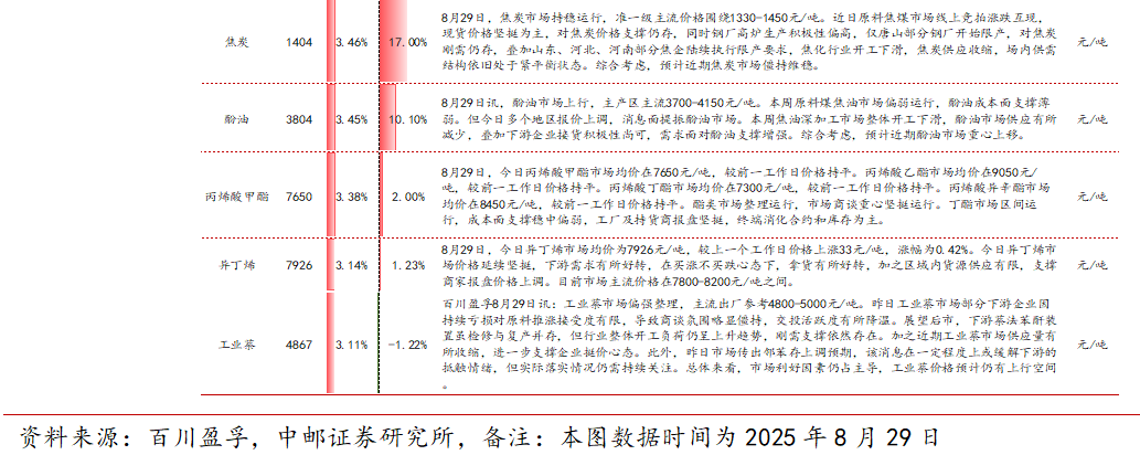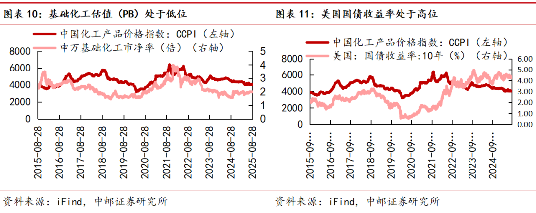 估值端,估值有望迎来提升。截止2025年8月29日,基础化工估值(PB)为1.98倍,处于2014年以来21.04%低分位,十年期美国国债收益率4.23%,处于2014年以来83.18%高分位,估值有望迎来提升。
